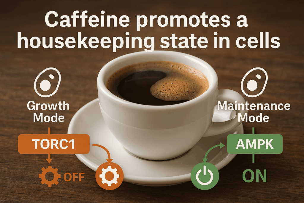 To understand what caffeine does, it helps to know that our cells generally operate in one of two modes: “growth mode” or “maintenance mode.” Growth Mode is when a cell puts all its energy into growing and dividing. While important for development, staying in this mode constantly makes cells tired and is linked to faster aging. The main controller of this process is a pathway called TORC1. The “Maintenance Mode” is a protective, self-preservation state. In this mode, the cell slows down on growth and instead focuses on housekeeping. It cleans out waste, repairs damage to DNA, and recycles old parts to keep itself running efficiently. The master switch for this process is an enzyme known as AMPK.