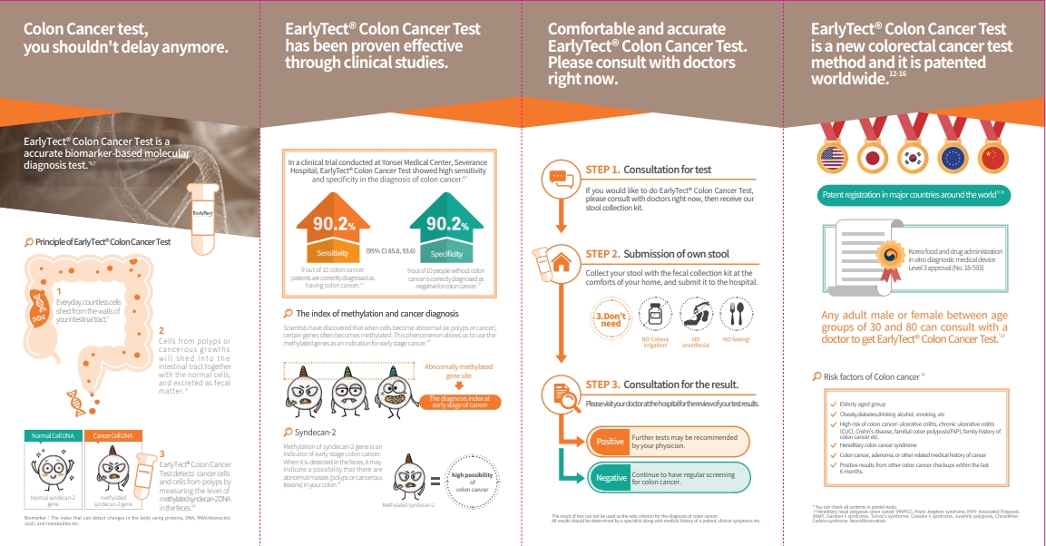 - ความไวและความจำเพาะสูง : ด้วยความไว 90% และความจำเพาะ 90% EarlyTect จึงให้ผลลัพธ์ที่เชื่อถือได้โดยไม่คำนึงถึงระยะทางคลินิก ตำแหน่งเนื้องอก เพศ หรืออายุ