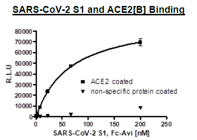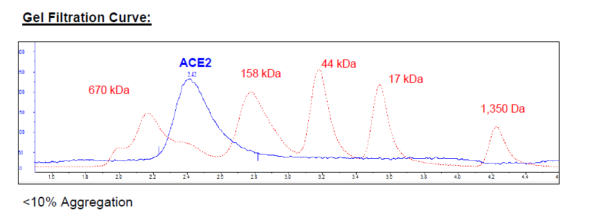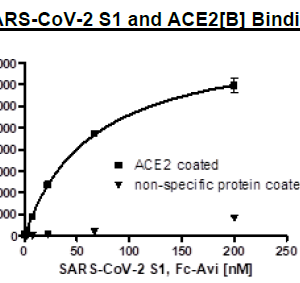 Human Angiotensin converting enzyme 2 (ACE2) also known ACEH, GenBank Accession No. NM_021804.3, a.a. 18-740, with a C-terminal His-tag, expressed in a HEK293 expression system and enzymatically biotinylated using Avi-tag™ technology. Biotinylation is confirmed to be ≥90%. MW=86 kDa. This protein runs at a higher MW by SDS-PAGE due to glycosylation.