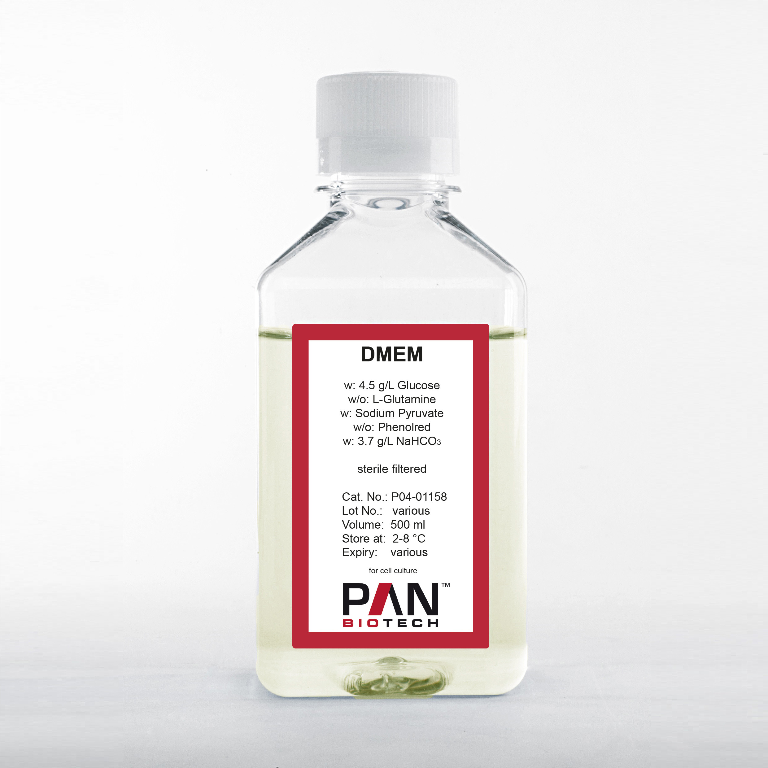 DMEM, w: 4.5 g/L Glucose, w/o: L-Glutamine, w: Sodium pyruvate, w/o: Phenol red, w: 3.7 g/L NaHCO3