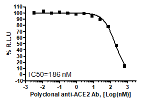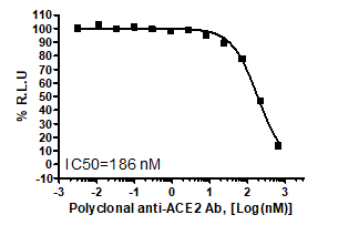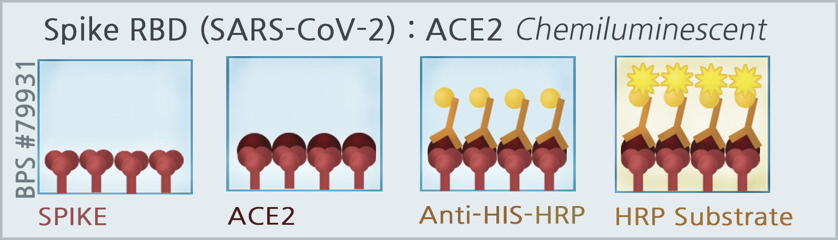 The Spike S1 RBD (SARS-CoV-2): ACE2 Inhibitor Screening Assay Kit is designed for screening and profiling inhibitors of this interaction. The key to this kit is the high sensitivity of detection of bound His-labeled ACE2 by HRP-labeled Anti-His. Only a few simple steps on a microtiter plate are required for the assay. First, SARS-CoV-2 Spike S1 is coated on a 96-well plate. Next, ACE2-His is incubated with SARS-CoV-2 Spike S1 on the plate. Finally, the plate is treated with Anti-His-HRP followed by addition of an HRP substrate to produce chemiluminescence, which then can be measured using a chemiluminescence reader.